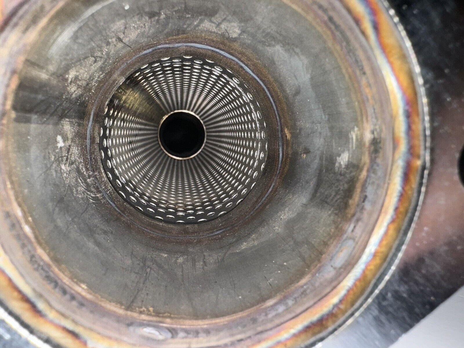 Oversized resonator and muffler with unique stainless steel mash/fiberglass packing help reduce drone.