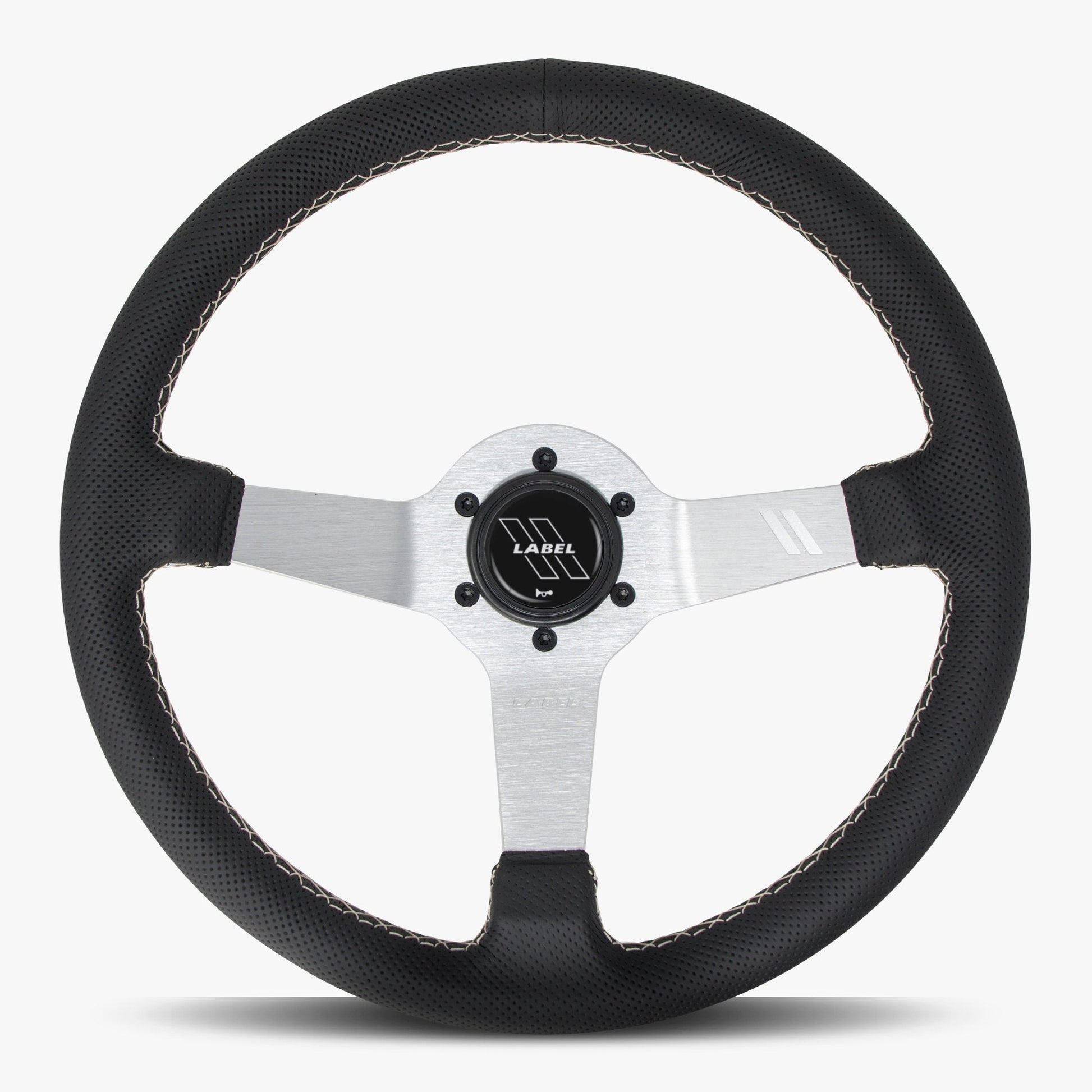 The Classic Black Perforated Leather Steering Wheel with Silver Spoke and White Stitch