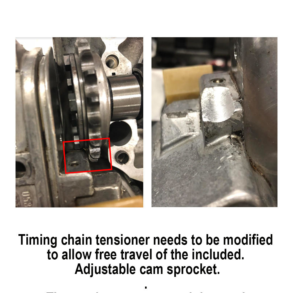 - Timing chain tensioner needs to be modified to allow free travel of the included Adjustable cam sprocket.