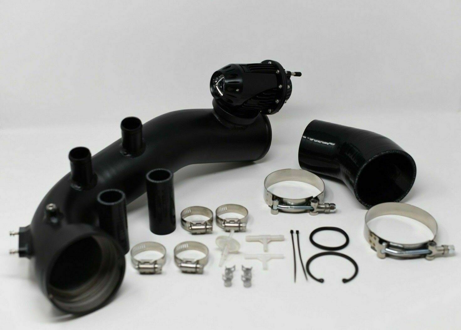 The N54 aluminum replacement chargepipe is a great high quality low cost upgrade to your flimsy factory plastic chargepipe. The piping is 3" throughout preventing any possible flow restriction, the throttle body flange is CNC machined for a factory fit, and the aluminum piping powder coated black for a great looking and long lasting finish. Each pipe includes dual 1/8" NPT bungs, high pressure t-bolt clamps, and all hardware required for installation. This is simply the best value for stronger N54 chargepipes out there. E chassis N54 only. Does not fit F chassis N55. Comes with SSQV BOV and ALL Hardware necessary for installation.